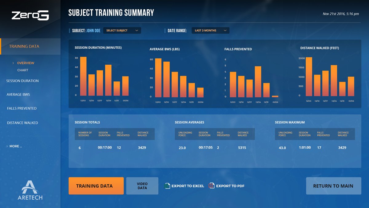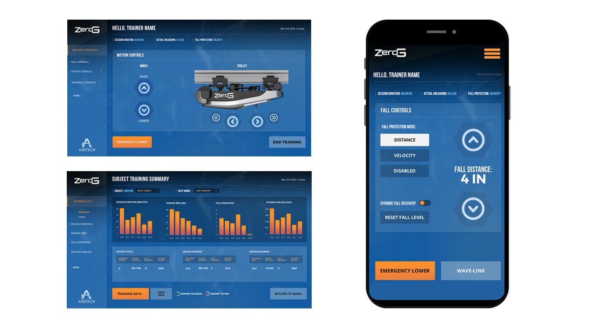 Complementing the physical design, we developed a sophisticated user interface (UI) for the ZeroG system. Our design process included wireframes to outline the functionality and multiple look-and-feel concepts to ensure the final product was both intuitive and visually appealing. The UI, implemented on both a 24-inch touchscreen and a mobile app, allows therapists to control settings, monitor patient progress, and adjust therapeutic regimens in real-time. This dual-platform approach ensures flexibility and ease of use, whether in a clinical setting or during active therapy sessions.